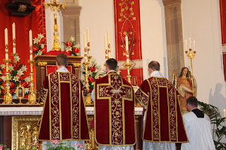 Der Altarraum war super geschmückt mit langen roten Paramenten und es gab sogar große Engelfiguren an den Seiten des Altars. Die scheinen sonst nach dem 2. Vaticanum ja als erste auf dem Dachboden gelandet zu sein, die Engel und die Heiligen. Schwer beeindruckt von diesem opulent geschmückten Altarraum!